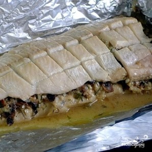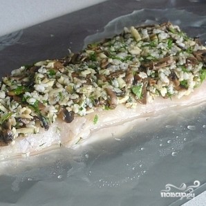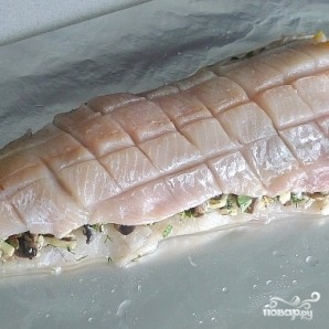 Второй кусок филе выкладываем сверху на начинку. Аккуратненько прижимаем. На верхнем филе делаем надрезы (как на фото). Сбрызгиваем маслом.