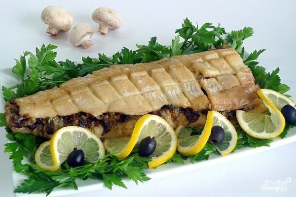 Остается только переложить щуку в сервировочное блюдо и украсить. У меня стандартный набор — зелень, лимон, черные оливки. Приятного аппетита!