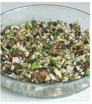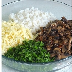 Сыр натираем на средней терке, зелень мелко рубим. Выкладываем в одно блюдо сыр, зелень, рис и грибы.