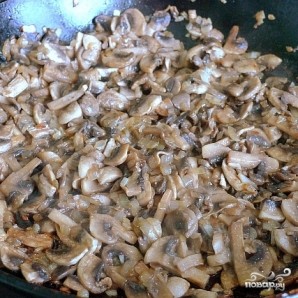 Лук и шампиньоны мелко нарезаем. В сковороде разогреваем масло, сперва бросаем туда немного лука, через пару минут забрасываем шампиньоны и жарим, помешивая, 3-4 минуты.
